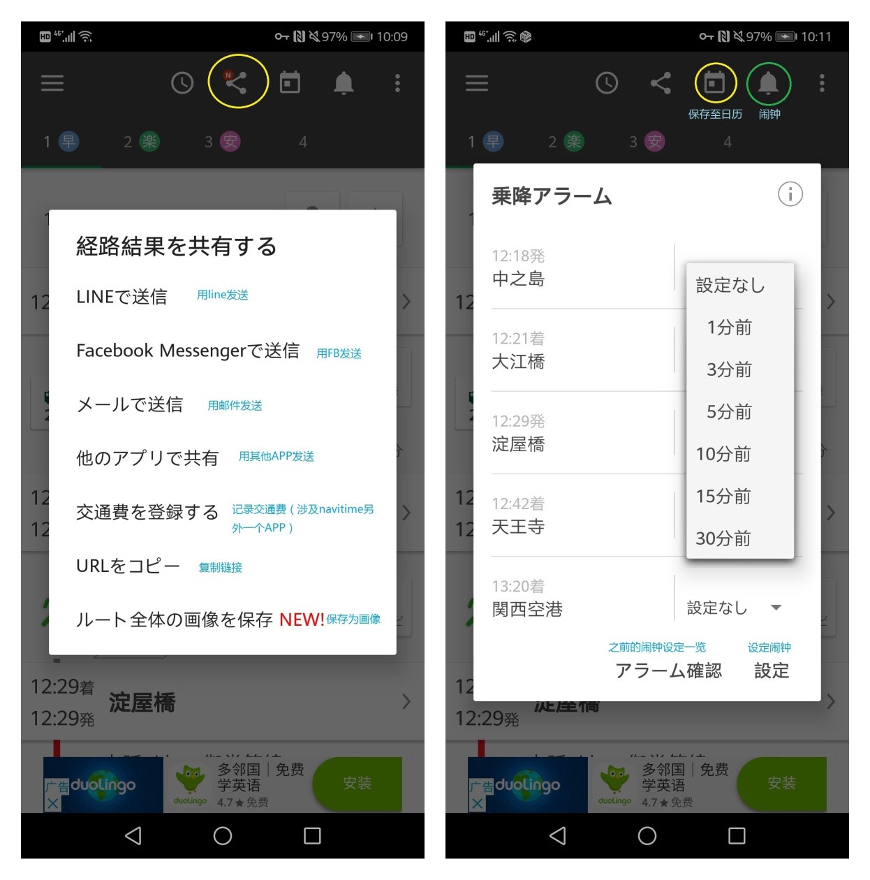 方案页右上角的菜单栏可以实现“路线共享”、“归入日历”、“设置到站闹钟提醒”等功能。