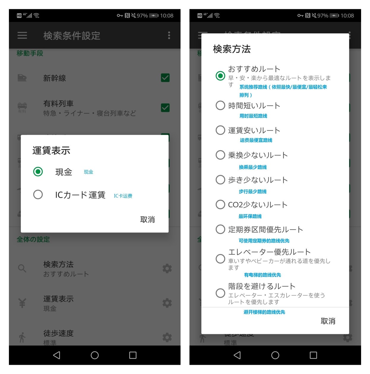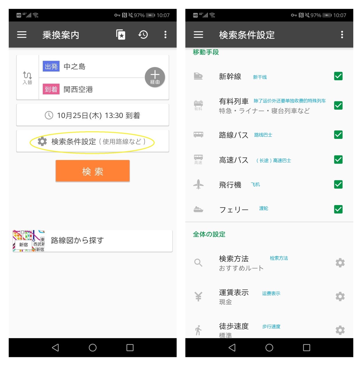 对“移动手段”(是否用新干线、是否用有料列车、巴士、飞机、渡轮)以及检索方法、运费表示(现金运费or IC card运费,一般来说用IC card,包括西瓜卡 ICOCA等运费会稍微便宜点)、步行速度设置(如果教程慢的,可以设置为慢速,这样系统会给出不同的换乘方案)