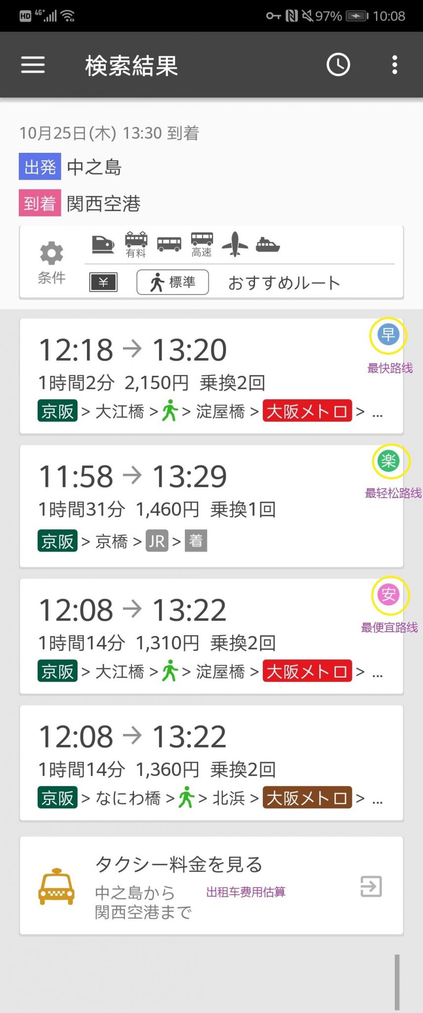 最快路线(通常是用时最短路线)、最轻松路线(换乘次数少、步行距离小,适合出行时间相对宽裕,但是不熟悉日本交通的人)、最便宜路线。