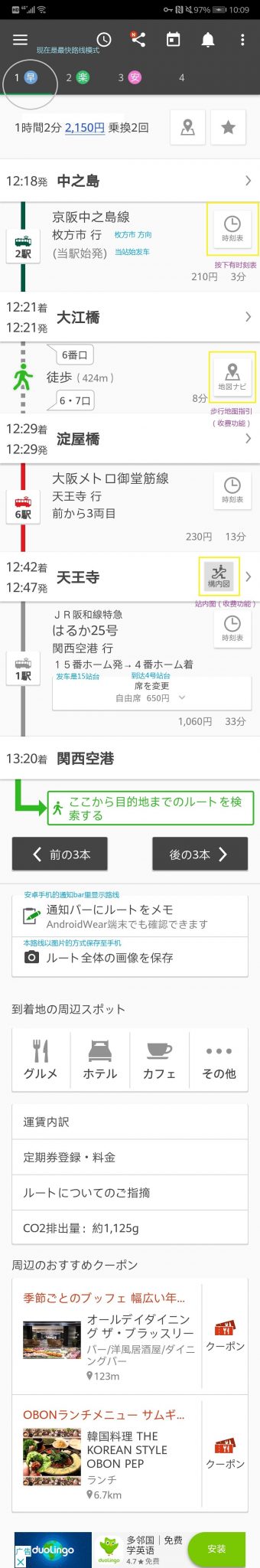 同时,如果没有赶上现在的列车,想查询同样路线的铁道组合下一班要怎么走,可以点击“後の3本”。