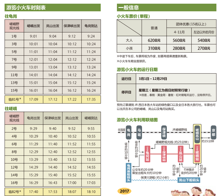 岚山小火车的起点/终点之站为トロッコ嵯峨野 /トロッコ亀岡,两个站点离JR嵯峨野 /JR亀岡都只有咫尺之遥。而从京都站坐JR到JR嵯峨野站只需要15分钟。除了岚山小火车,保津川游船也能连接起岚山与龟冈两大景点,但是游船不接受网路预订,只能电话预约,在此不展开讨论了。