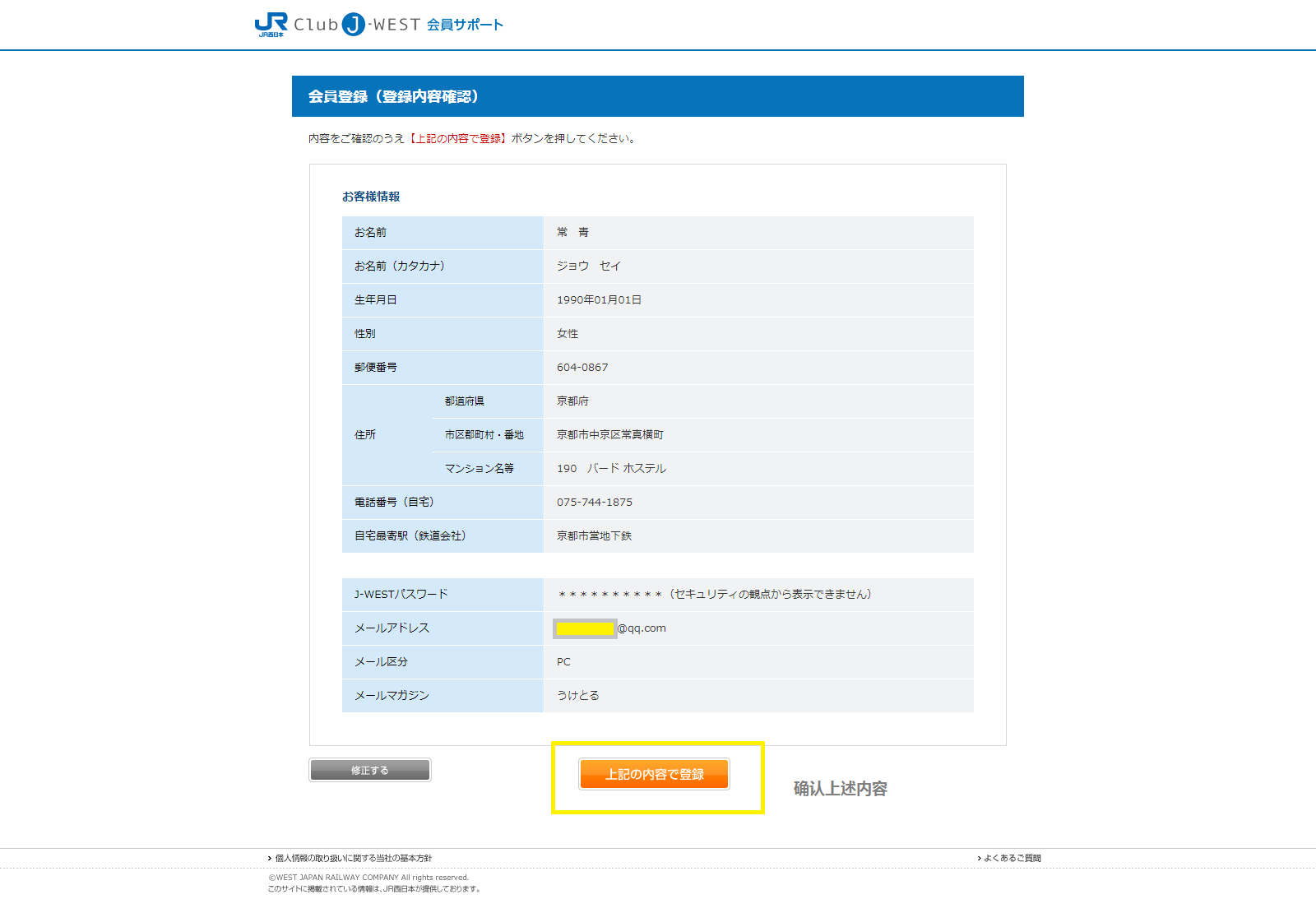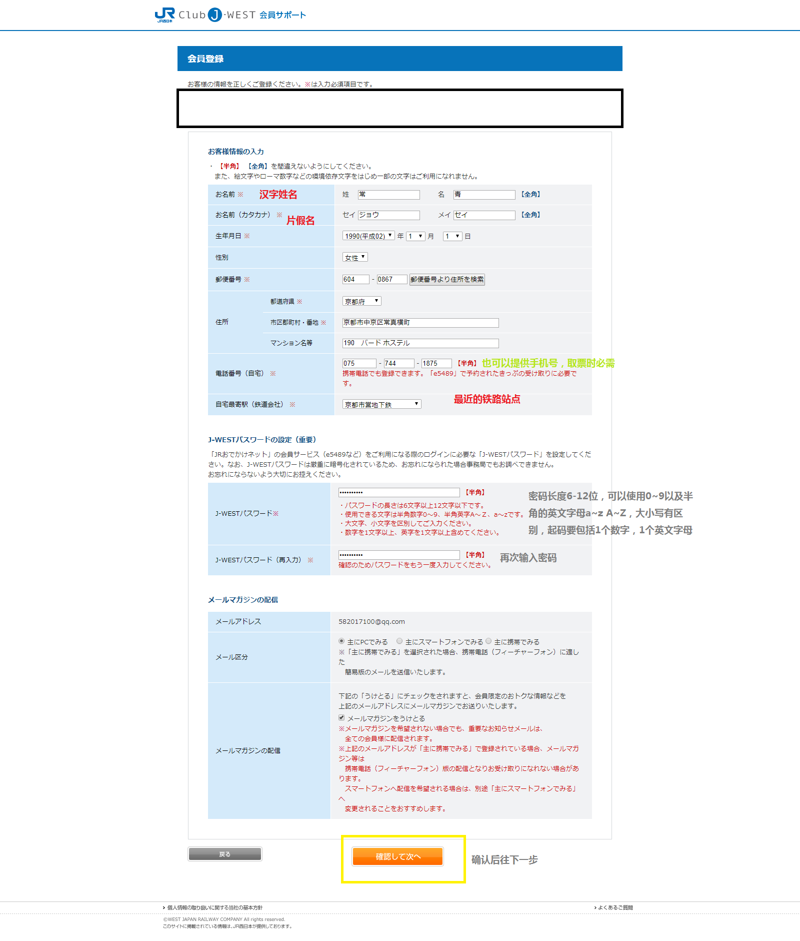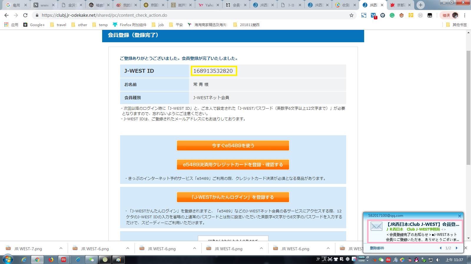 核对完信息之后,按橙色按钮确认,之后就会得到系统分配给你一个12位数字的JR WEST ID.