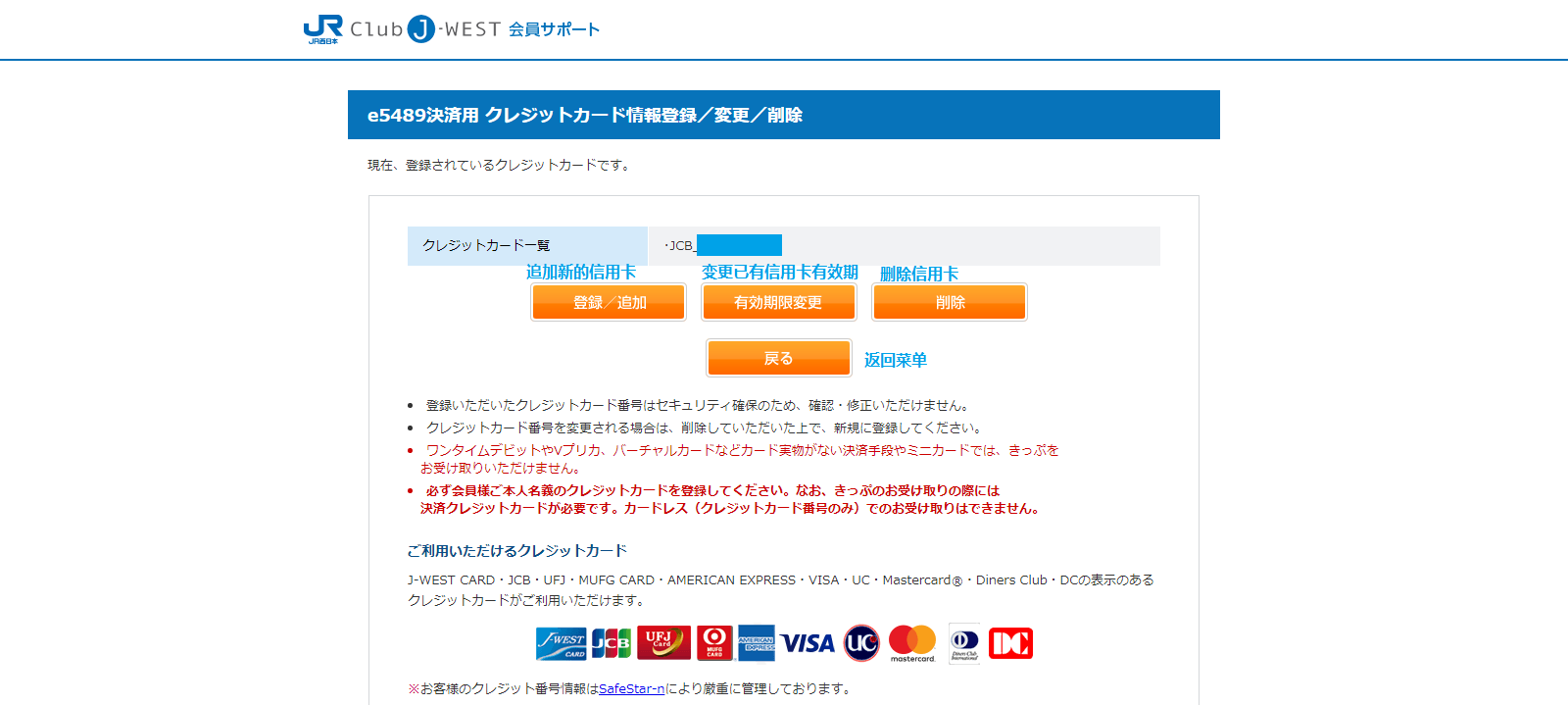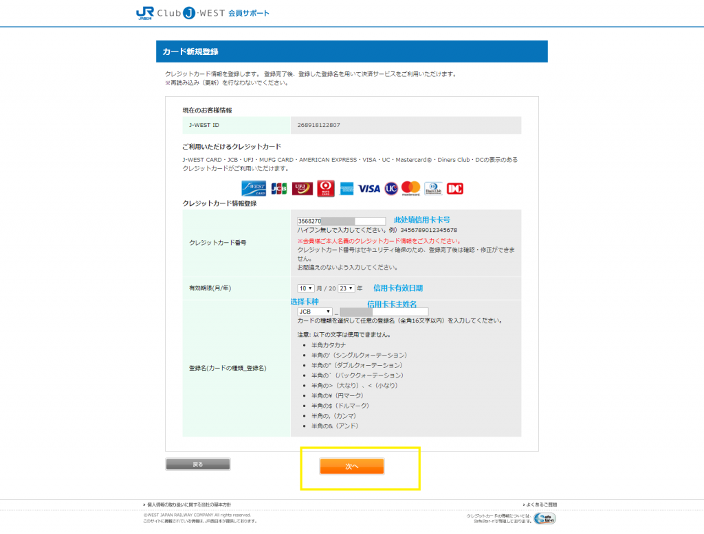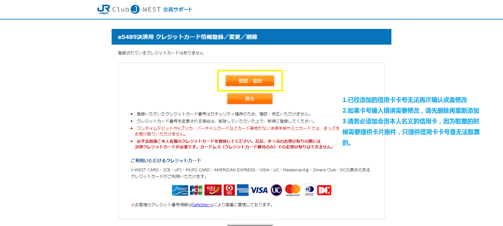 注册完JR-WEST的ID之后,我们需要绑定一张本人名义的国际信用卡,用来支付车费。