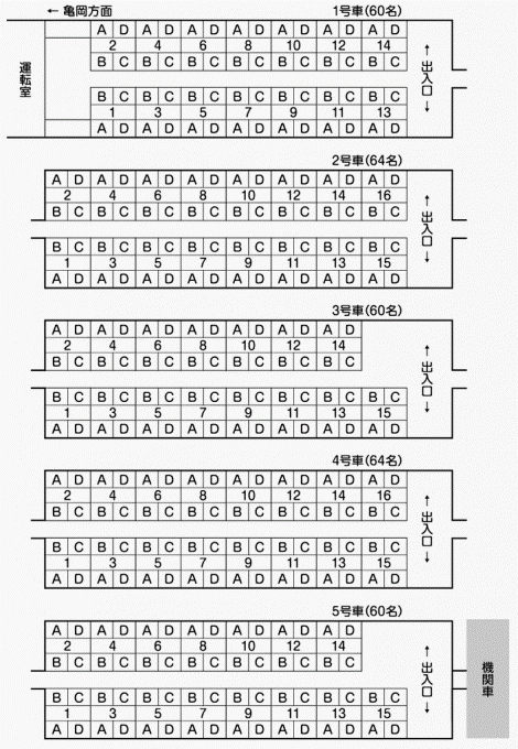 岚山小火车共5节车厢,前四节是一般车厢,第五节为リッチ号(敞开式无窗车厢)。