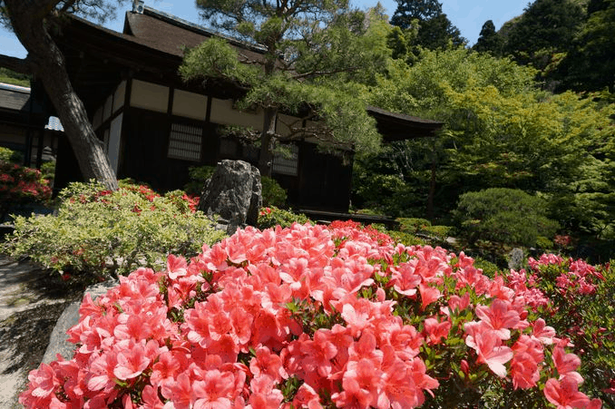 這張照片裏是初夏的杜鵑花,但在這個小窗口中卻表現了四個季節的風景,例如秋天的秋葉,冬天的雪和春天的櫻花。