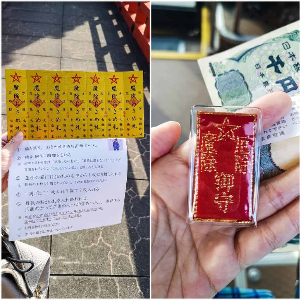 據傳安倍晴明也曾經在此地修行過陰陽道,為了蹭晴明的熱度,04年在晴明千年祭的時候重修了晴明堂,現在入寺參拜時如果購買進本堂門票,還會送印有五角星陰陽道圖案的吉野葛餅配抹茶。對於搞封建迷信活動有特別愛好的同學,推薦金閣浮禦堂霊寶館走壹遭。入館前會送七まいりおさめ劄加禦守り壹個。七まいりおさめ劄是七枚用於祈福除厄的金色硬紙卡片,拿到卡片後先對著浮禦堂正面行壹禮,然後順時針方向繞堂壹周,口中念叨要祈福的內容(官方示範:“OOしないように”格式),每轉完壹圈,往正面的箱子裏投入壹枚卡片,直到轉完七圈為止。