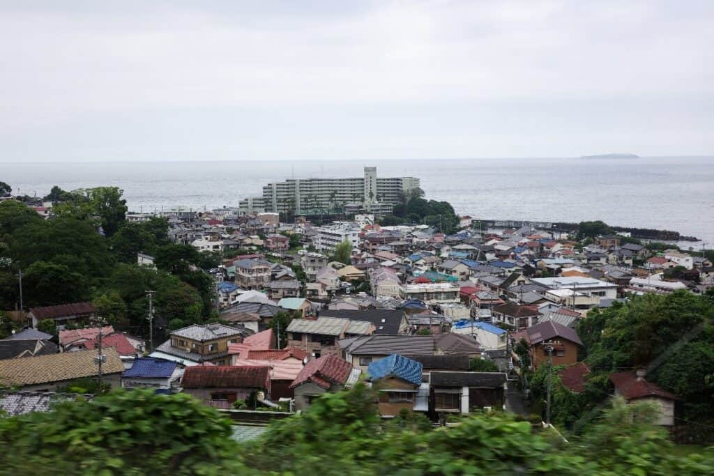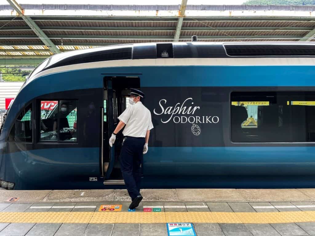從東京出發到伊豆半島,踴り子號特急從熱海站一分為二,一列繼續西行駛往三島,然後南下直插修善寺,一列拐往伊東,沿著海岸線,奔向下田。 從東京到修善寺,暴雨下到令人心驚,雨幕模糊了窗外的一切,包括本應令人心旌神搖的風景。 等一夜後風消雨收,隱約有些放晴的跡象,對於從下田回橫濱那段海岸線,自然會生出無限的期待與想像。 踴り子號的sapphire車只行駛於下田線,全車Green席,倘若訂得早,或許還能訂到家族用的包廂席,直接向海而坐。 臨行前才訂座,自然搶不到包廂席,於是選了餐車前部5號車廂的靠窗坐,打算一逼近海岸便去餐車搶位置。