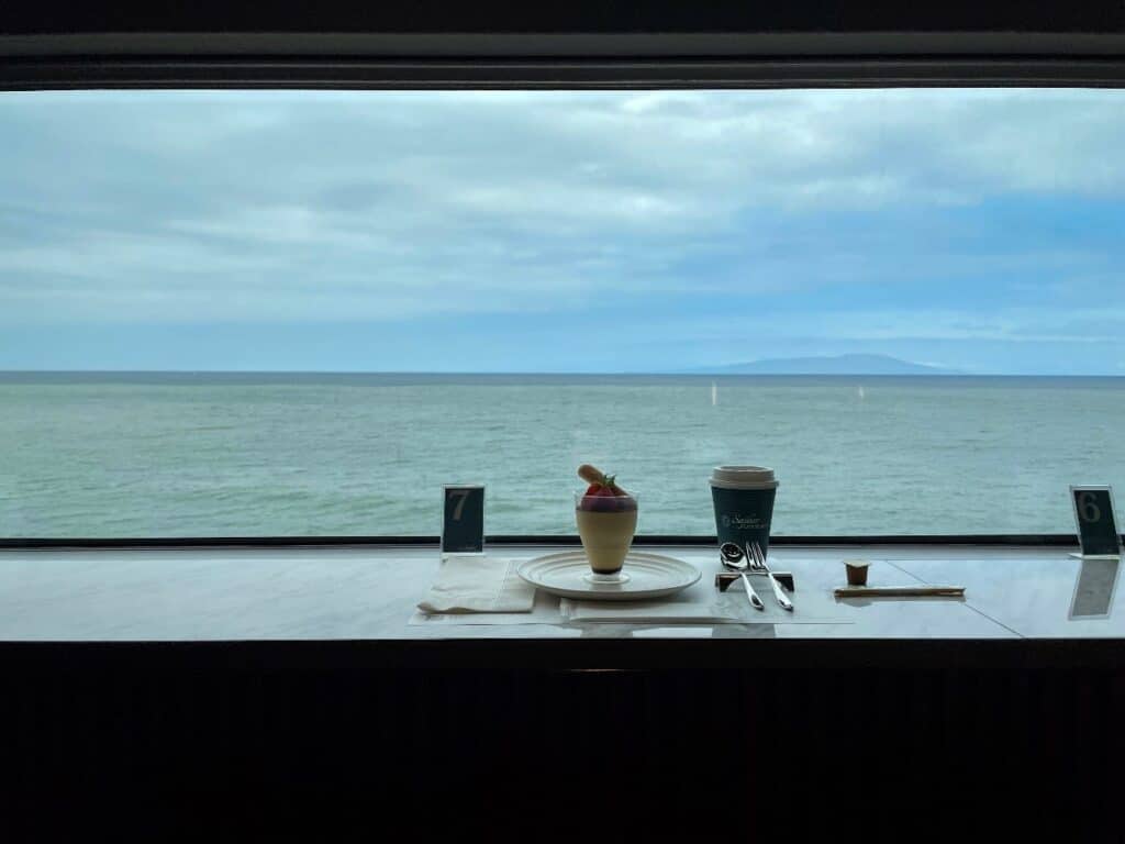 有吧台的餐車為獨行旅人帶來溫暖,counter席正對大海,民居、海浪、沉甸甸的雲朵、飄零於天地間的海鳥,生動地、一覽無餘地展現在眼前。 點了一份紅茶+提拉米蘇套餐,不過星巴克的價格,餐點上齊後有40分鐘左右的用餐時間限制。