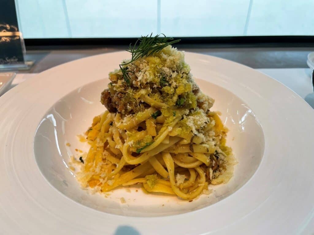 等車過伊豆熱川,我已經對面海而坐這件事無法自拔,毅然再加點了一份鰯とウイキョウのリングイネ~香草ヿン粉ゃミー付き),1900的含稅價 堪稱良心。 背後卡座上,一大家子人含兩個小朋友已經熱鬧鬧鬧吃起了咖哩飯,配上伊豆產的蜜柑汁,讓人彷彿置身於移動的野餐公園。